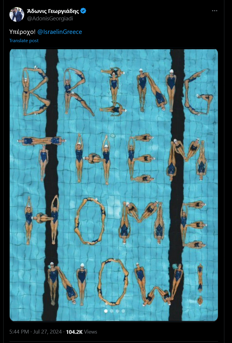 Τι ισχύει με την συγκεκριμένη φωτογραφία. Αρχικά εμφανίστηκε σε πολλούς λογαριασμούς, όπως για παράδειγμα στον λογαριασμό του Αγγλικού i24NEWS, γράφοντας στην περιγραφή του ότι οι Ισραηλινοί κολυμβητές θέλησαν να στείλουν ένα μήνυμα για τους 240 ομήρους που απήγαγε η Χαμάς και κρατούνται στη Γάζα.