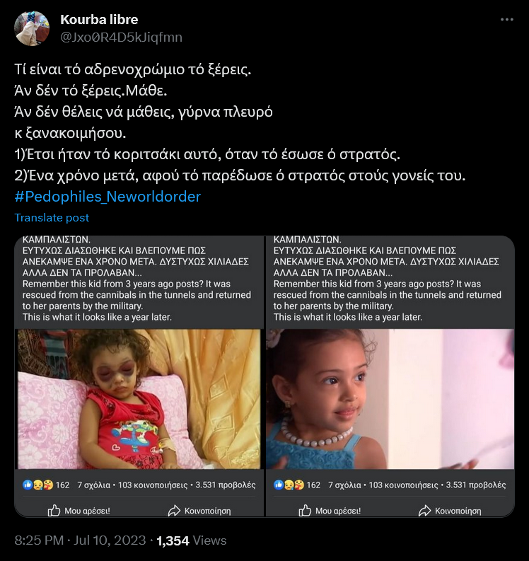 Σύμφωνα με τις αναρτήσεις, το κοριτσάκι αυτό το έσωσε ο στρατός από παιδόφιλους, κανιβαλιστές και άτομα που το κράταγαν για να του πάρουν το αδρενοχρώμιο. Μία από τις αναρτήσεις αυτές, είναι και η παρακάτω.