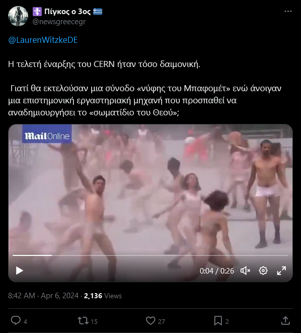 Σε αναρτήσεις στα κοινωνικά δίκτυα, κυκλοφορεί ένα στιγμιότυπο, όπου σύμφωνα με όσους την αναρτούν, υποτίθεται ότι δείχνει την τελετή έναρξης του CERN. Μία από τις αναρτήσεις αυτές, είναι η παρακάτω.
