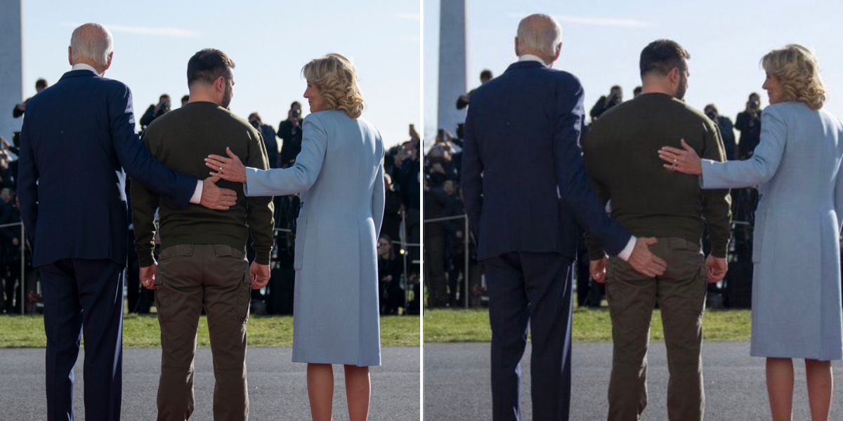 Με την βοήθεια της αντίστροφης αναζήτησης εικόνων, βρέθηκε η πηγή της πραγματικής φωτογραφίας. Την φωτογραφία μοιράστηκε η πρώτη κυρία της Αμερικής, Τζιλ Μπάιντεν, όπου δείχνει τα χέρια τους τοποθετημένα στη μέση της πλάτης του προέδρου Ζελένσκι.