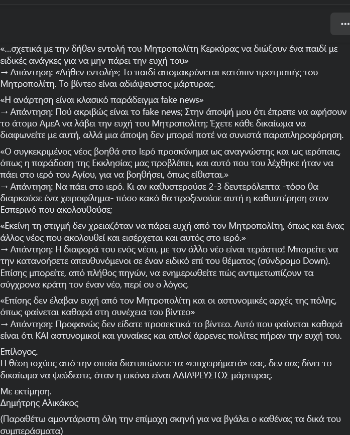 Επίσης βλέπουμε καθαρά ότι ο ισχυρισμός της Μητρόπολης ότι δεν έλαβαν ευχή από τον Μητροπολίτη και οι αστυνομικές αρχές της πόλης είναι αληθής, αφού φαίνεται καθαρά στη συνέχεια του βίντεο, ενώ αργότερα βλέπουμε το παιδι ΑΜΕΑ να ασπάζεται το χέρι του Μητροπολίτη.